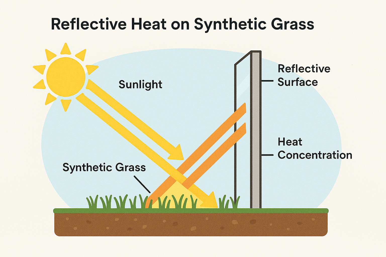 Reflective heat occurs when sunlight bounces off surfaces such as windows, glass pool fences, metal panels, or even light-colored walls and concentrates onto your synthetic grass. Unlike natural grass, which can recover from heat stress, artificial turf is made from plastic polymers that can soften or melt under extreme temperatures.